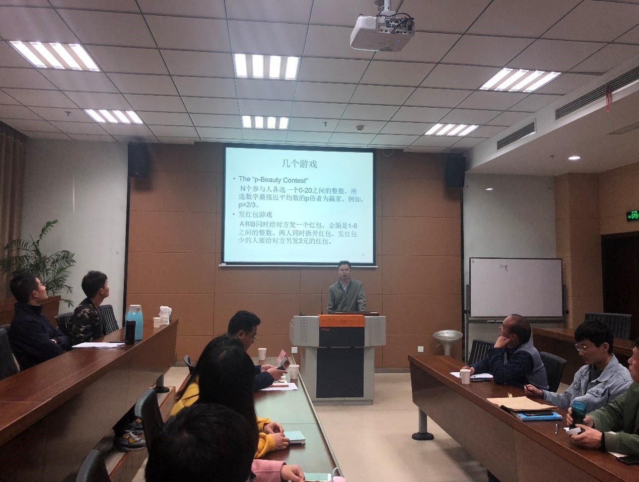 讲座中,卢教授结合博弈论相关理论,从狮子游戏等一些简单的话题引入,介绍了经典的囚徒困境博弈以及双寡头博弈理论,并就纯策略纳什均衡、混合策略纳什均衡以及混合策略纳什均衡的求解方法等诸多博弈论相关问题,与在座师生深入探讨了均衡策略如何在物联网产业发展资源配置中发挥应有的作用。卢教授的讲座由浅入深,热情耐心,与会师生认真专注,互动讨论,受益匪浅,充分领略了博弈论及其应用的魅力所在。