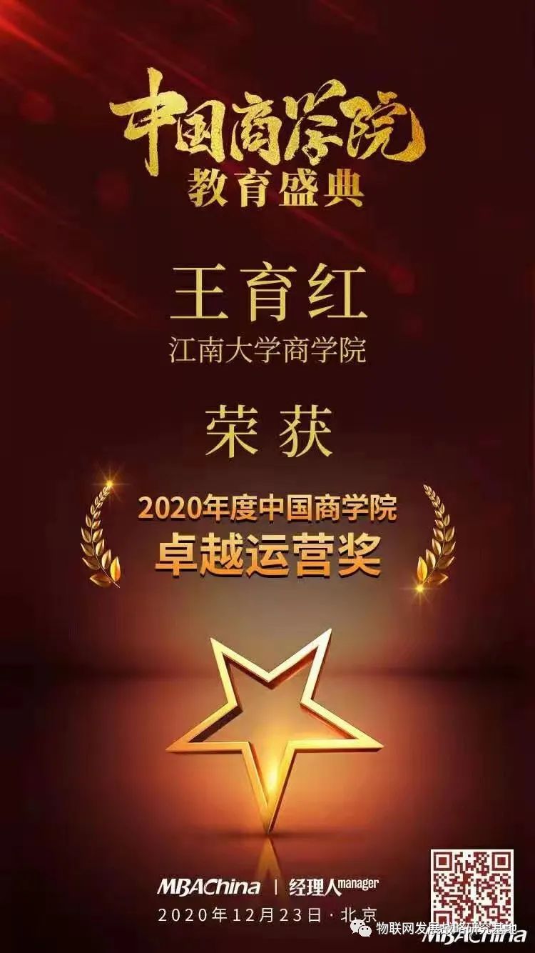 强强对决,物联网基地王育红教授荣获“2020年度中国商学院卓越运营奖。王育红教授负责学院的国际交流与认证工作,并于2018年获得| 0AMBA国际认证;已开展AACSB国际认证并通过EA阶段;负责教育部批复的江南大学-澳大利亚蒙纳士大学合作举办的工商管理专业本科教育项目入选“江苏高校中外合作办学高水平示范性建设工程”。