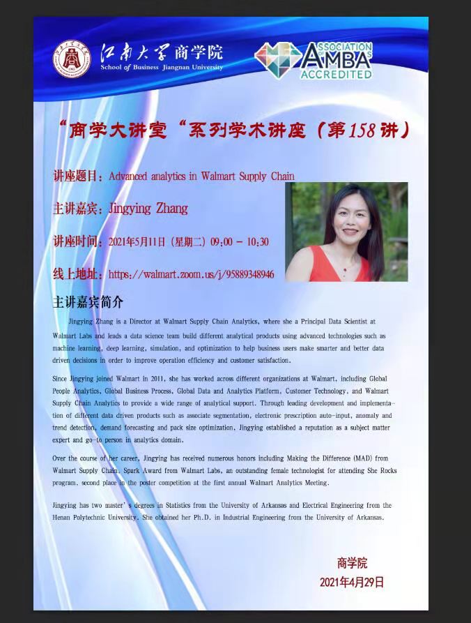 5月11日上午九时商学院308室,基地邀请沃尔玛供应链分析总监、沃尔玛实验室的首席数据科学家Jingying Zhang博士作为主讲嘉宾,主讲题为“沃尔玛供应链的前沿分析”的学术讲座。本次讲座由江南大学商学院副院长王育红教授主持。商学院教师和各专业研究生参加了本次讲座。