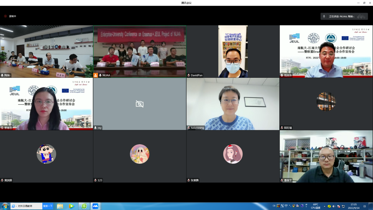 9月14日下午,欧盟Erasmus+资助的Joint Enterprise University Learning(JEUL)项目校企合作研讨会成功召开。本次研讨会的主题是关于南京航空航天大学与江南大学就校企合作的经验与取得的成果,进行分享和交流。会议通过线上的方式举行,来自南京航空航天大学,江南大学的教授,同学以及企业代表共计17人参加,南京航空航天大学经济与管理学院副院长、教授谢乃明,经济与管理学院一流专业建设办公室主任、副教授关叶青,经济与管理学院院长助理、副教授陆珩瑱,经济与管理学院管理科学与工程系教学主任、副教授何沙玮,经济与管理学院国际合作事务秘书许志卓,江南大学商学院副院长王育红、钱吴永,商学院教授刘勇,商学院副教授季春艺,以及来自常州集硕医疗器械有限公司,泉峰集团,捷普电子(无锡)有限公司、江苏佳利达国际物流股份有限公司等4家企业高管和代表共同参加研讨会。研讨会由南京航空航天大学经济与管理学院副院长、教授谢乃明主持。